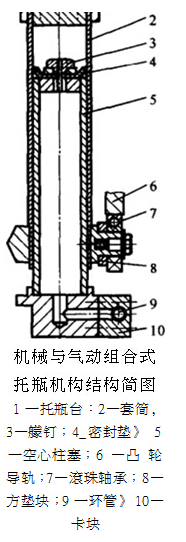 该图示出了机械和气动瓶保持机构的示意图。装备有瓶子保持器1的套筒2可以沿着中空柱塞5滑动,并且方形块8用作防止套筒升高或降低时挠曲的导向件。当提起瓶子时,压缩空气从柱塞的下部通过钉子3上的中心孔进入套筒,以促进瓶子的运动。它的速度由凸轮导向器6和导流轴承7控制,直到工作台转到瓶子放置区域。然后,套筒和瓶子固定器1在凸轮的强制作用下被完全按下。同时,柱塞内部的压缩空气仍被排放到连接到每个瓶筒气路的环形管中,然后进入另一个将要上升的瓶筒。