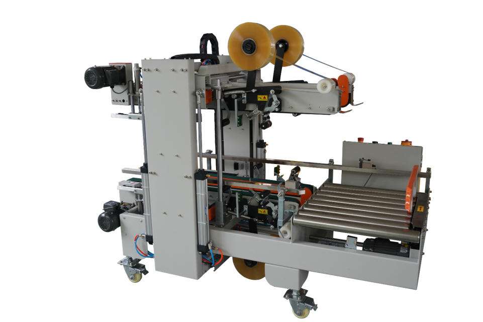 封箱机采用即贴胶带封纸箱封口,经济快速、容易调整,可一次完成上、下封箱动作,也可以采用印字胶带,更可提高产品形象,是企业自动化包装的首选。可分为半自动封箱机、自动封箱机、全自动封箱机、气动封箱机、折盖封箱机、角边封箱机、侧边封箱机等系列。生产的封箱机轻巧耐用,操作简单;广泛适用于家电、电子、食品、乳品、油类、化妆品、饮料、电器等制造行业。